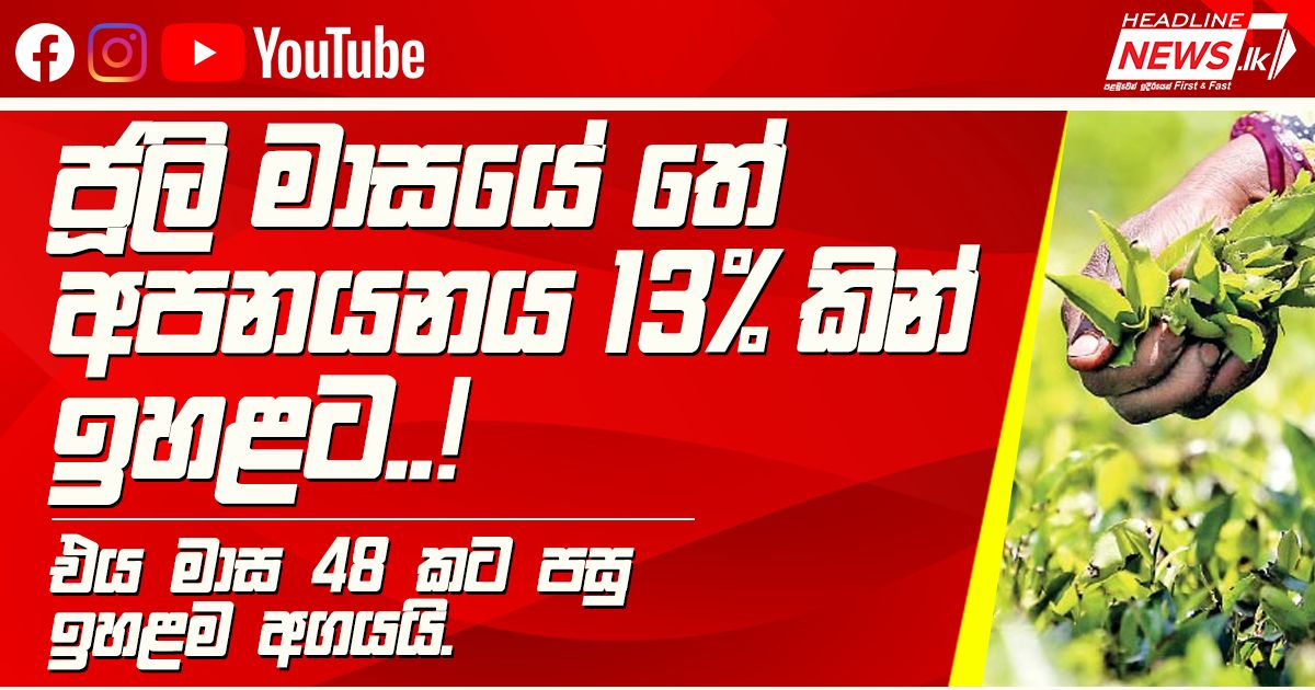 ජූලි මාසයේ තේ අපනයනය 13% කින් ඉහළට..! එය මාස 48 කට පසු ඉහළම අගයයි. ජූලි මාසයේ දී තේ කිලෝ ග්රෑම