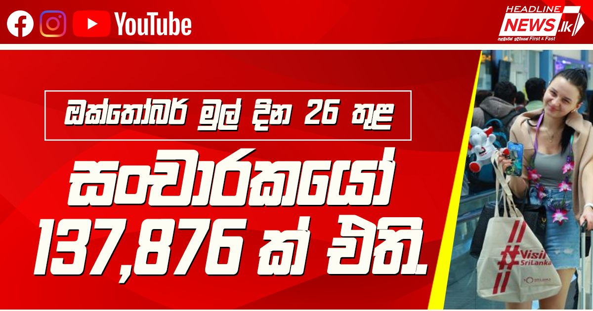 ඔක්තෝබර් මුල් දින 26 තුළ සංචාරකයෝ 137,876 ක් එති. ඔක්තෝබර් මාසයේ මුල් දින 26 තුළ විදේශීය සංචාරකයන
