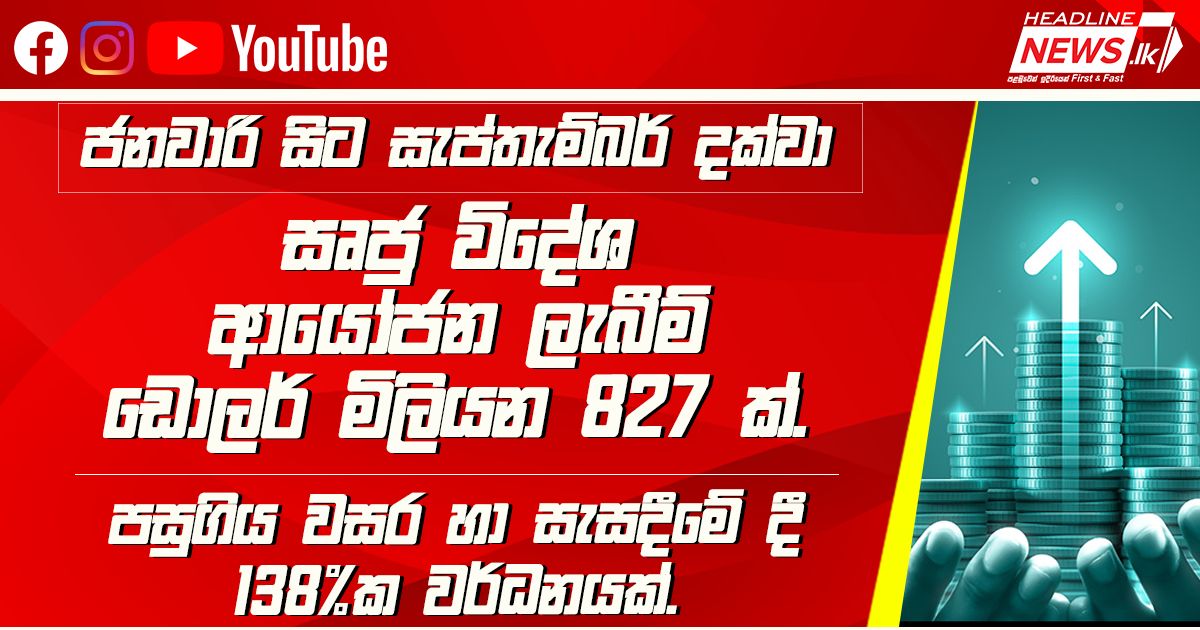 ජනවාරි සිට සැප්තැම්බර් දක්වා සෘජු විදේශ ආයෝජන ලැබීම් ඩොලර් මිලියන 827 ක්. පසුගිය වසර හා ස
