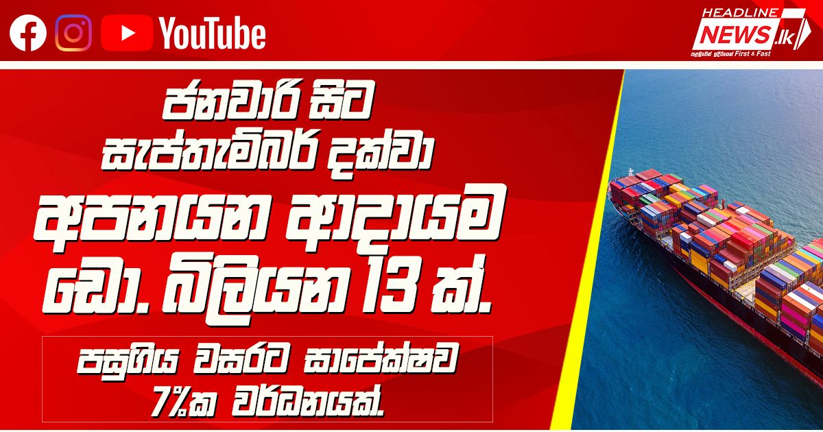 ජනවාරි සිට සැප්තැම්බර් දක්වා අපනයන ආදායම ඩොලර් බිලියන 13 ක්. මේ වසරේ ජනවාරි සිට සැප්තැම්බ