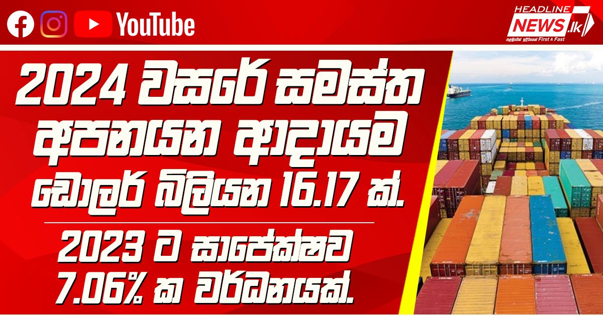 2024 වසරේ සමස්ත අපනයන ආදායම ඩොලර් බිලියන 16.17 ක්. 2023 ට සාපේක්ෂව 7.06% ක වර්ධනයක්. 2024 වසරේ දී ශ්රී ලංක