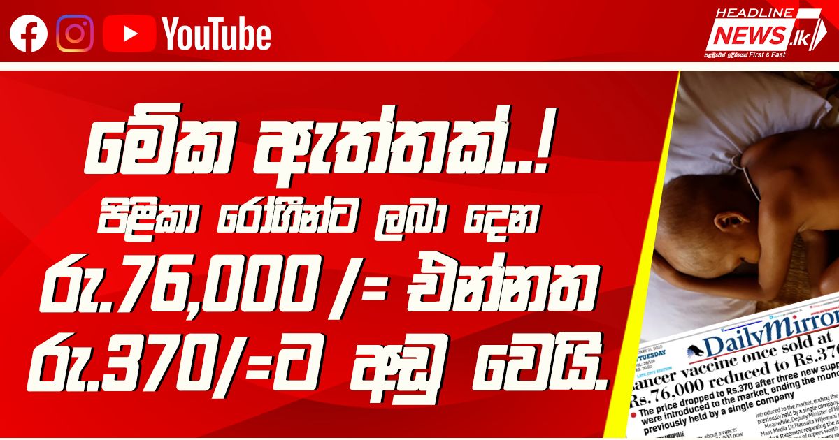 මේක ඇත්තක්..! පිළිකා රෝගීන්ට ලබා දෙන රුපියල් 76,000 /= එන්නත රුපියල් 370/= දක්වා අඩු වෙයි.පිළිකා රෝ