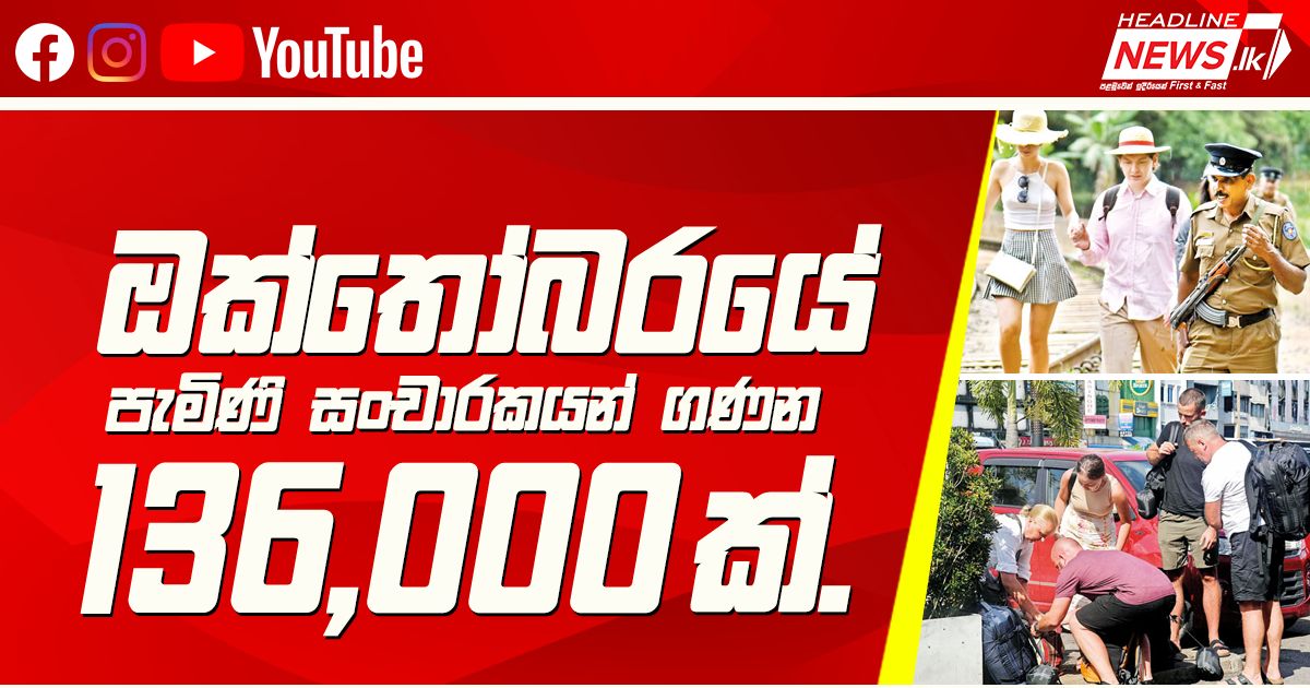 ඔක්තෝබරයේ පැමිණි සංචාරකයන් ගණන 136,000 ක්. ඔක්තෝබර් මාසයේ දිවයිනට පැමිණ තිබෙන සංචාරකයන් සංඛ