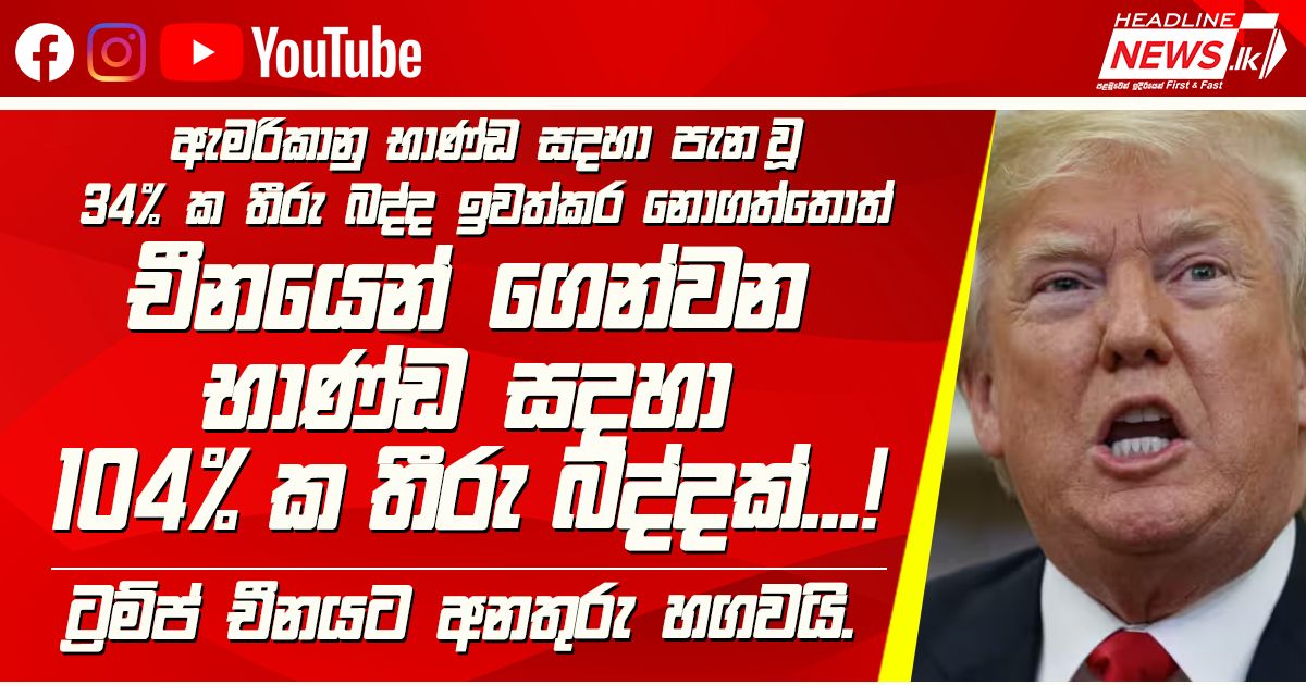 "ඇමරිකානු භාණ්ඩ සදහා පැනවූ 34% ක තීරු බද්ද ඉවත්කර නොගත්තොත් චීනයෙන් ගෙන්වන භාණ්ඩ සදහා 104% ක