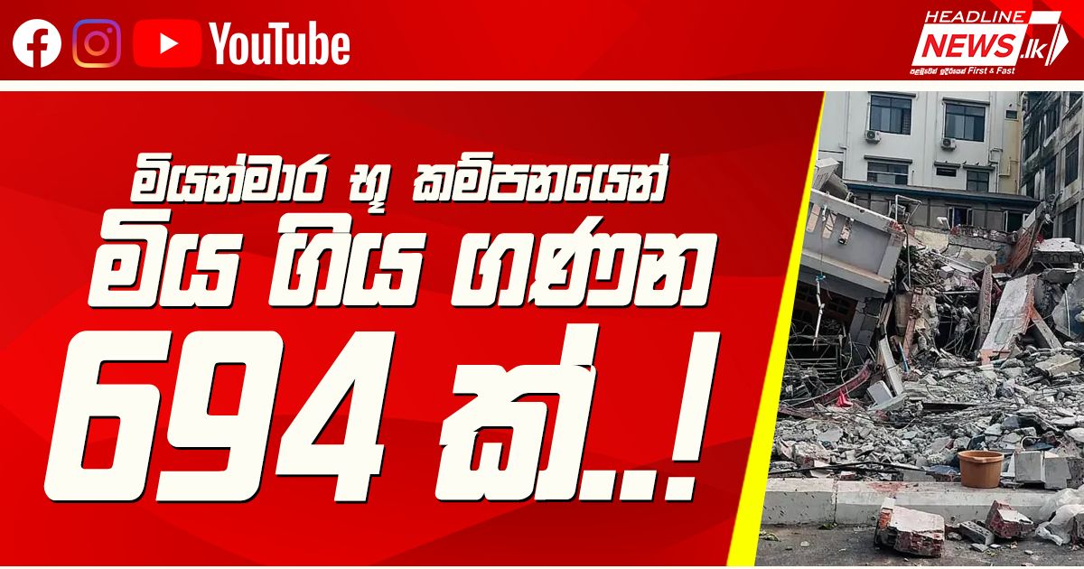 මියන්මාර භූ කම්පනයෙන් මිය ගිය ගණන 694 ක්. ඊයේ දිනයේ දී මියන්මාරයට බල පෑ දරුණු භූ කම්පනයෙන් පුද